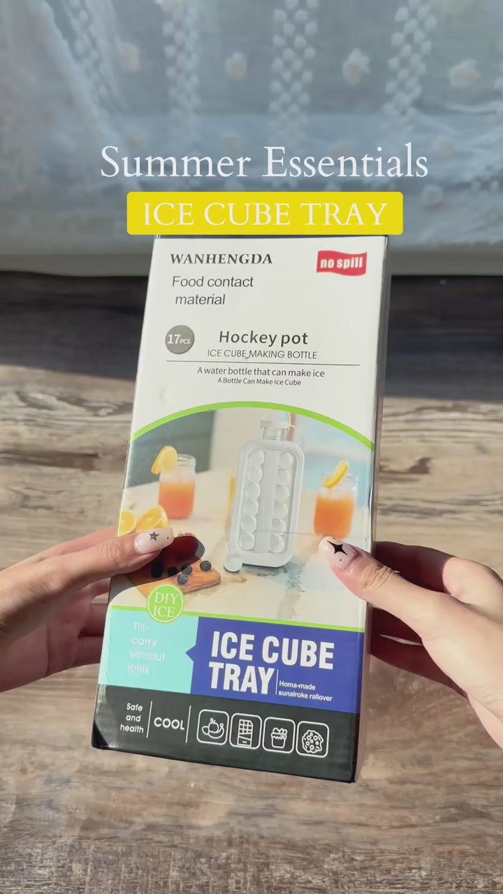 ✔ 2-in-1 Design (box text: “A water bottle that can make ice”) – Works both as a water bottle and an ice cube mold.